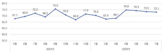 한국건설산업연구원(건산연)은 올해 7월 건설기업 경기실사지수(CBSI)가 전월 대비 0.4포인트 하락한 73.1을 기록했다고 5일 밝혔다. 이지혜 건산연 연구위원은 “7월 체감 건설경기는 3개월 연속 하락하며 기준치인 100을 크게 밑돌아 부진한 흐름이 지속되고 있다”고 분석했다.