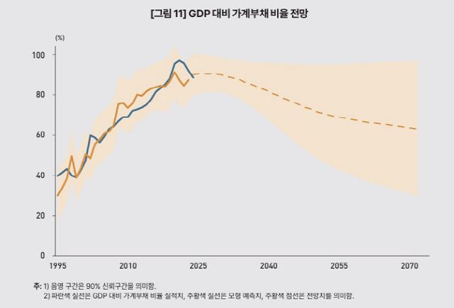 통계청에 따르면 2070년까지 기대수명이 90.9세까지 늘어날 것으로 예상되는 가운데, KDI는 이에 따른 가계부채 비율이 2025년 대비 약 29.5% 상승할 것으로 내다봤다. 반면 같은 기간 고령화에 따른 인구구성 변화는 가계부채 비율을 약 57.1%포인트 낮추는 요인으로 작용한다. 이에 이 같은 구조적인 인구변화는 2070년 가계부채 비율을 현재보다 약 27.6% 낮추는 효과가 있는 것으로 분석됐다.
