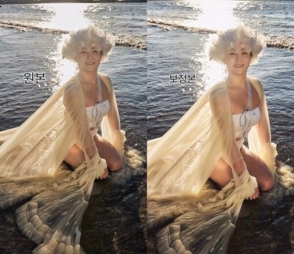 영상 속에서 원본 사진은 목선을 다듬거나 밝기를 키우는 등 기본적인 수정만 거쳤을 뿐, 보정 전후로 큰 차이가 없어 시선을 모았다. 해변에 누워있는 컷 역시 마찬가지였다. 이목구비가 또렷하게 보이도록 밝기와 색상만 조정되었고, 과도한 보정은 찾아볼 수 없었다.