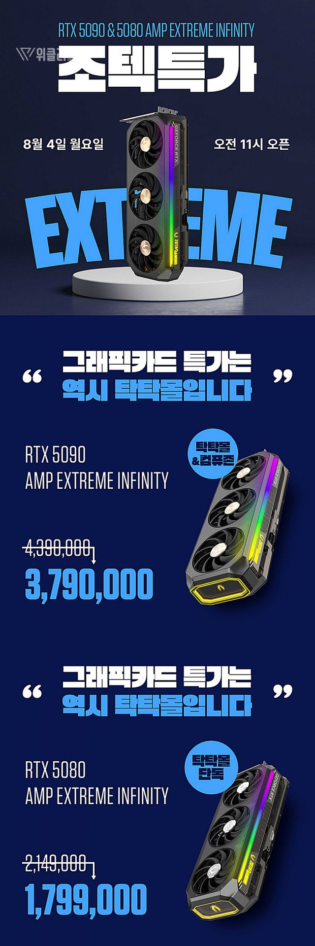 ZOTAC GAMING GeForce RTX 5090 AMP Extreme Infinity는 조텍 공식 쇼핑몰 탁탁몰과 컴퓨존에서 8월 4일 오전 11시부터 동시 특가가 진행된다. ZOTAC GAMING GeForce RTX 5080 AMP Extreme Infinity는 탁탁몰에서 단독으로 제공된다. 가격은 각각 3,790,000원과 1,799,000원이며, 특가는 8월 6일까지 또는 수량 소진 시 종료된다.