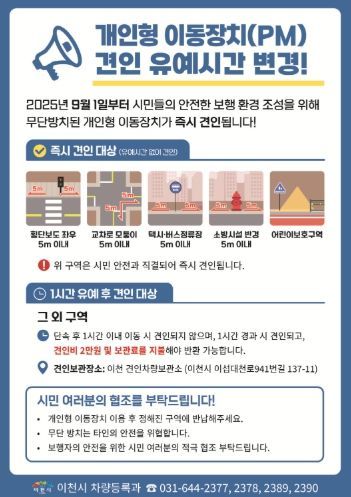 [와이뉴스] 이천시는 보행자의 안전을 위협하는 불법 주정차 개인형 이동장치에 적극 대응하기 위해 오는 9월 1일부터 개인형 이동장치 견인 유예 시간을 변경한다.