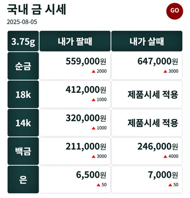 순금(24K) : 매입가 64만 7000원 / 매도가 55만 9000원