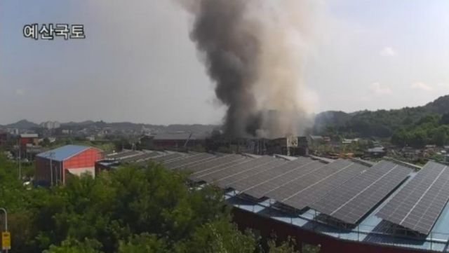 충남 홍성군은 오전 7시 20분경 인근 주민들에게 “차량은 건물 주변 도로를 우회하고, 유독가스 등 안전에 유의하라”는 내용의 안전 안내 문자를 발송했다.