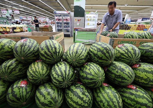 7월 소비자물가가 가공식품·수산물 상승세 영향으로 두 달째 2%대 상승세를 이어가고 있는 가운데 5일 서울의 한 대형마트를 찾은 시민이 수박을 고르고 있다 / 뉴스1