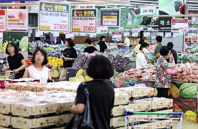 7월 소비자물가가 가공식품·수산물 상승세 영향으로 두 달째 2%대 상승세를 이어가고 있는 가운데 5일 서울의 한 대형마트를 찾은 시민들이 장을 보고 있다 / 뉴스1