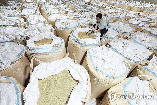 경기도 화성시 수라청농협쌀조합공동사업법인 저온창고에서 관계자가 보관 중인 쌀을 살펴보고 있다 / 연합뉴스