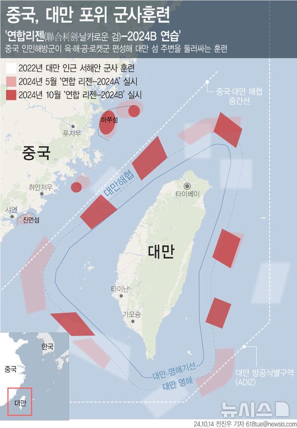인민해방군(PLA) 중국 인민해방군은 지난해 5월 라이칭더 총통 취임 직후 등 두 차례에 걸쳐 '연합리젠 ‘날카로운 칼(聯合利劍)-2024’ 훈련을 실시했는데 해공군과 해안경비대가 동원돼 대만 주위를 봉쇄하는 것이 주요 내용이었다.