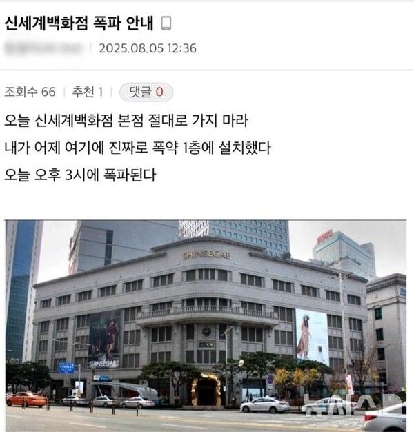 서울 중구 신세계백화점 본점에 폭발물을 설치했다는 내용의 글이 인터넷에 올라오며 백화점 이용객들이 긴급 대피했다.