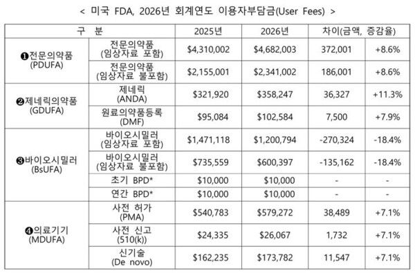 오는 10월 1일부터 적용되는 전문의약품(NDA·BLA)에 대한 2026년도 허가 심사 수수료는 468만 2003달러다. 올해 431만 달러(약 60억원)에 비해 37만 달러, 8.6% 인상됐다.