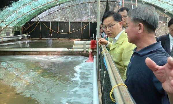 김성범 해양수산부 차관이 5일 경북 포항에 위치한 육상 강도다리 양식장을 찾아 고수온 대응현장을 점검하고 어업인의 노고를 격려했다.