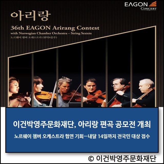 이건박영주문화재단이 '제36회 이건음악회 아리랑 편곡 공모전'을 개최하고, 새로운 감각으로 재해석된 아리랑을 찾는다. 응모 기간은 이달 5일부터 9월14일까지다.