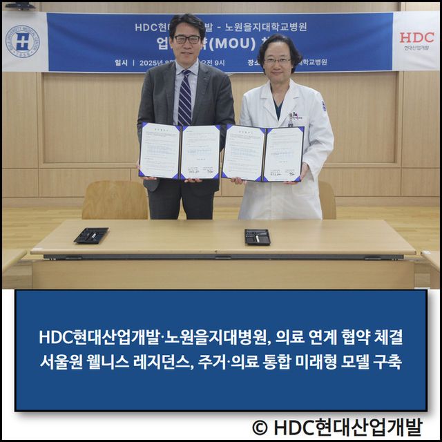 HDC현대산업개발(294870, 이하 HDC현산)은 노원을지대학교병원과 서울원 웰니스 레지던스 입주민을 위한 의료 연계 시스템 구축 협약을 체결했다고 5일 밝혔다. 이날 협약식에는 박희윤 개발본부장과 유탁근 병원장 등이 참석했다.