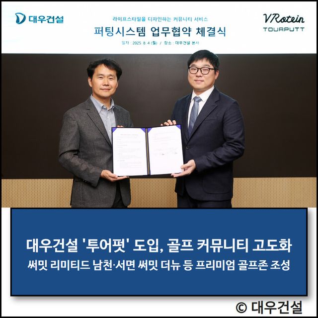 대우건설(047040)은 골프 퍼팅 시뮬레이터 전문기업 브로틴과 양해각서(MOU)를 체결하고, 주요 단지에 프리미엄 골프 연습장 '투어펏'을 도입한다고 4일밝혔다. 해당 단지는 '써밋 리미티드 남천'과 '서면 써밋 더뉴' 등이다.