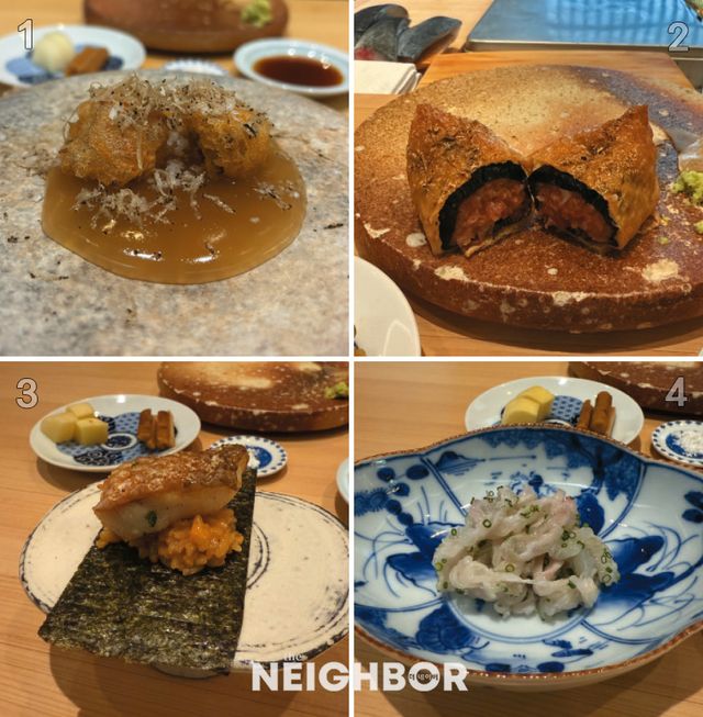 1 앙소스에 올린 튀긴 전복. 2 네기도로 유부말이. 3 금태 우니 테마키. 4 광어 뱃살과 실파.