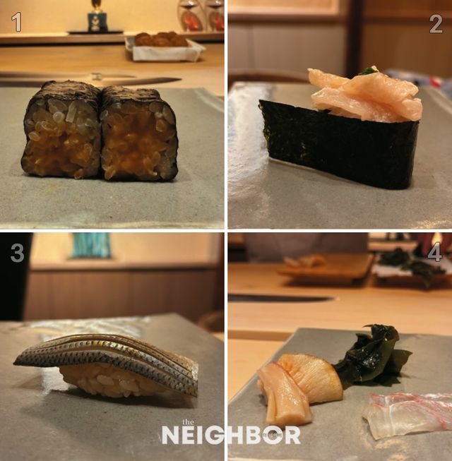 1 우니 마키. 2 쥐치, 쥐치간과 시소 야쿠미. 3 전어 니기리. 4 광어, 북방조개, 미역.