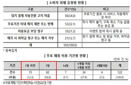 이어 ‘무료기간 이내 해지 제한 또는 방해’ 32.1%(53건), ‘이용요금 부당청구’ 21.2%(35건), ‘해지 시 위약금 청구 또는 해지 거부’ 12.7%(21건) 순으로 집계됐다.