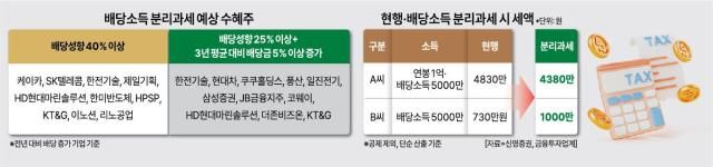분리과세를 적용하면 세 부담은 얼마나 낮아질까. 정부 안에 따르면 A씨는 분리과세 적용 시 2000만원에 대한 280만원, 나머지 3000만원에 대한 600만원 등 총 880만원을 배당소득세로 내야 한다. 근로소득 1억원에는 세율 35%가 적용돼 세금이 3500만원 부과된다. 이를 합하면 분리과세 도입 시 A씨 세 부담은 4380만원으로 기존보다 500만원가량 줄어든다.