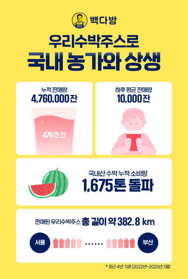 최근 4년간 우리수박주스의 누적 판매량은 약 476만잔으로, 매일 하루 평균 1만잔이 팔리고 있는 셈이다. 해당 기간 동안 판매된 우리수박주스 잔을 나열하면 길이는 약 382.8km로, 서울에서 부산까지의 직선거리(약 325km)를 넘어서는 수준이다.
