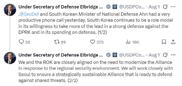 콜비 차관은 지난달 31일(현지시간) 엑스(X·옛 트위터)를 통해 “한국은 북한에 맞선 강력한 방어와 방위비 지출에서 계속해서 더 많이 주도적 역할을 기꺼이 맡겠다는 롤모델이 되고 있다”고 밝혔다.