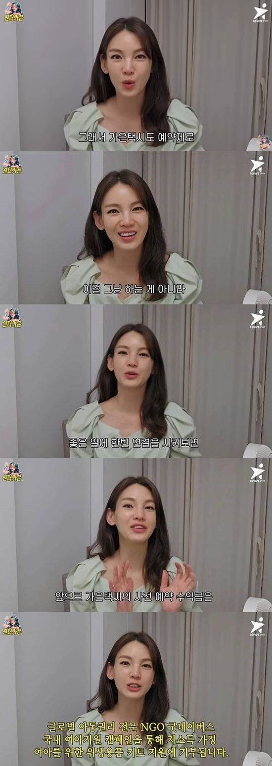 정가은은 "앞으로 가은택시의 사전 예약 수익금은 '글로벌 아동권리 전문 NGO 굿네이버스'의 '국내 여아지원 캠페인'을 통해 저소득 가정 여아를 위한 위생용품 키트 지원에 기부하려고 한다. 많이 응원해달라"고 당부했다.