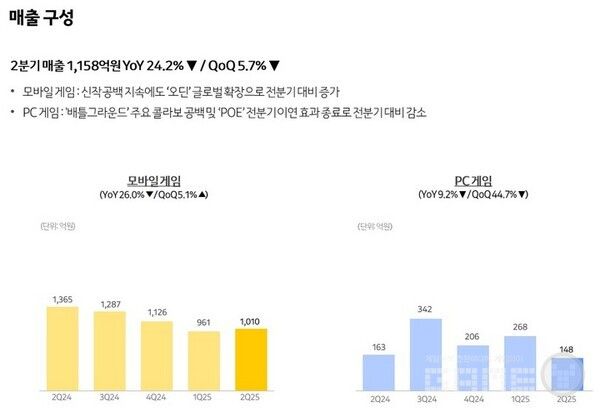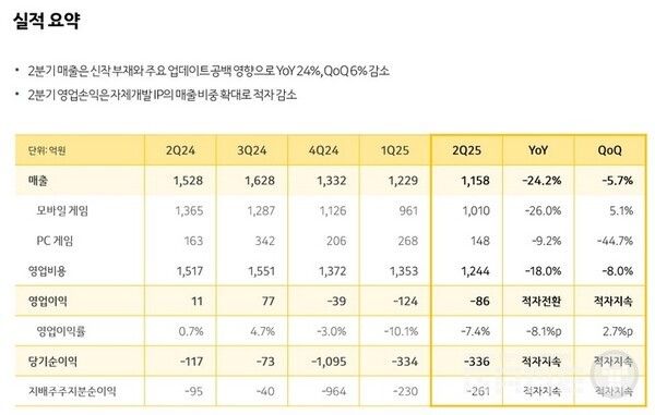올해 2분기 매출액은 약 1,158억 원으로 전년동기 대비 -24%, 전분기 대비 -6%를 기록했다. 플랫폼별로는 모바일 게임은 약 1,010억 원으로 전년동기 대비 -26%, 전분기 대비로는 5% 상승했다. PC 온라인 게임은 약 148억원으로 전년동기 대비 -9%, 전분기 대비 -45%의 매출을 기록했다.
