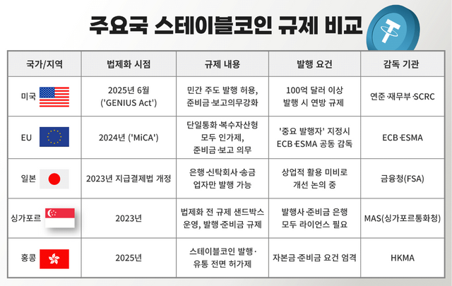 EU는 2024년 'MiCA'로 단일통화형(EMT)과 복수자산형(ART) 모두에 인가제, 준비금, 보고 의무를 부과했다. 일본은 2023년 지급결제법 개정으로 제도화했으나 상업적 구현이 없어 개선 논의를 이어가고 있다. 싱가포르와 홍콩도 이미 법제화를 완료했다.