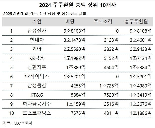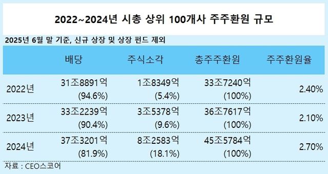 6일 기업데이터연구소 CEO스코어가 지난 6월 30일 기준 시가총액 상위 100대 기업을 대상으로 2022~2024년 주주환원총액을 조사한 결과, 지난해 100대 기업의 주주환원총액은 45조5785억원으로, 2022년 33조7239억원 대비 11조8546억원(35.2%) 증가했다.