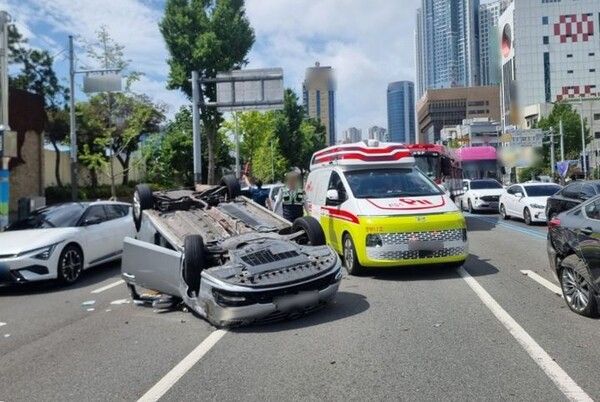 뉴시스 보도에 따르면, 6일 부산 동부경찰서에 따르면 이날 오전 10시28분께 동구의 한 도로에서 A(70대)씨가 몰던 차량이 유턴을 위해 대기 중이던 승용차를 들이받은 뒤 전복됐다.