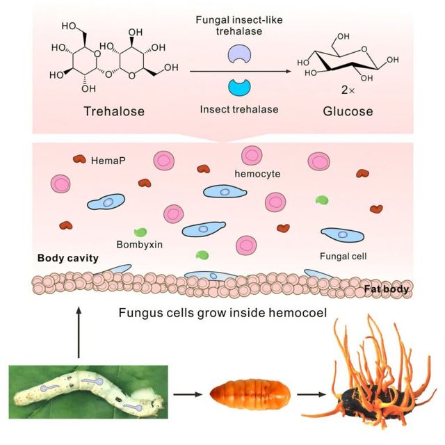 연구팀은 그 기전을 연구하기 위해 누에나방 애벌레에 이 곰팡이를 감염시킨 후 변화를 연구했습니다. 연구팀에 따르면 곰팡이는 HemaP라는 식욕 촉진 펩타이드를 생산하는 유전자를 자극해 식욕을 촉진할 뿐 아니라 애벌레의 몸속에 있는 주요 당성분인 트레할로스 (trehalose, 두 개의 포도당이 결합한 이당류로 곤충의 체액에서 가장 중요한 당류)를 분해하는 트레할라제 (trehalase)와 유사한 CmTreH1라는 효소를 분비해 트레할로스를 분해합니다.