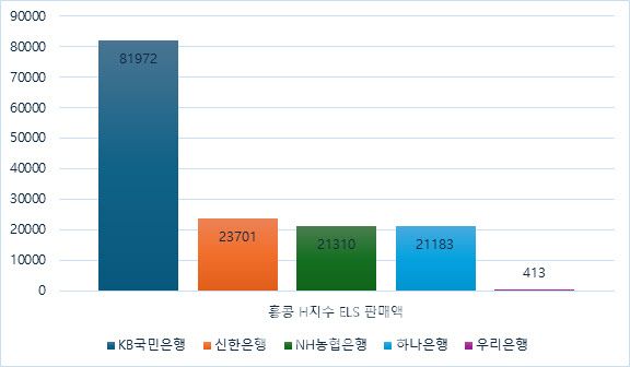 윤한홍 의원실에 따르면 홍콩H지수 ELS 판매액은 △KB국민은행 8조 1972억원 △신한은행 2조 3701억원 △NH농협은행 2조 1310억원 △하나은행 2조 1183억원 △우리은행 413억원에 달한다. 이 기준을 적용하면 KB국민은행은 최대 4조원, 신한은행과 농협은행, 하나은행 등은 1조원의 과징금을 물 수도 있다.
