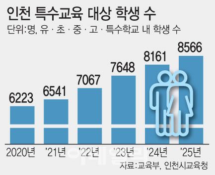 6일 교육부와 인천시교육청에 따르면 인천의 유·초·중·고·특수학교 내 장애학생 수는 2020년 6223명(4월1일 기준)에서 올해 8566명으로 2343명이 늘었다. 2021년에는 6541명이었던 장애학생 수가 2022년 7067명, 2023년 7648명, 지난해 8161명으로 매년 증가했다.