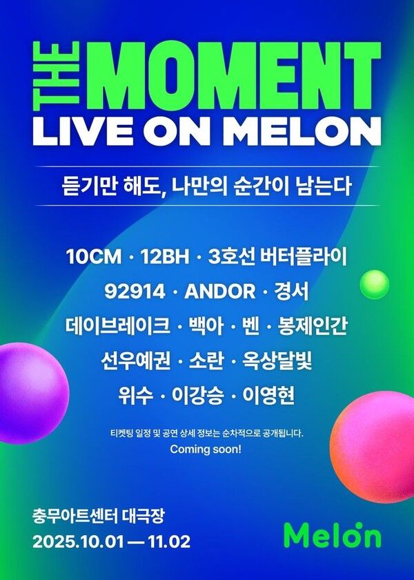 뉴시스 보도에 따르면, 6일 멜론에 따르면, 멜론 유료회원들을 위한 스페셜 공연과 팬·아티스트를 잇는 팬미트업(FAN MEET-UP) '더 모먼트: 라이브 온 멜론(The Moment : Live on Melon)'이 오는 10월1일부터 11월초까지 서울 중구 충무아트센터 대극장에서 펼쳐진다.