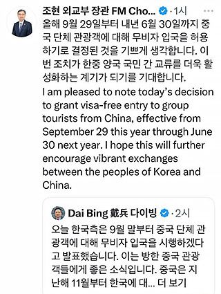 6일 조 장관은 사회관계망서비스(SNS)인 'X'의 본인 계정에 "올해 9월 29일부터 내년 6월 30일까지 중국 단체 관광객에 대해 무비자 입국을 허용하기로 결정된 것을 기쁘게 생각한다. 이번 조치가 한중 양국 국민 간 교류를 더욱 활성화하는 계기가 되기를 기대한다"라는 메시지를 남겼다. 그러면서 조 장관은 다이빙 주한 중국대사가 관련 내용을 언급한 것을 리트윗(재전송)하기도 했다.