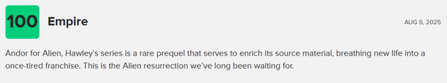 <에이리언>을 위한 <안도르>라고 할 수 있는 노아 홀리의 시리즈는 보기 드문 프리퀄로, 원작을 더욱 풍성하게 만들며 한때 지쳐 있던 프랜차이즈에 새로운 생명을 불어넣는다. 우리가 오랫동안 기다려온, 진정한 ‘에일리언의 부활’이다.