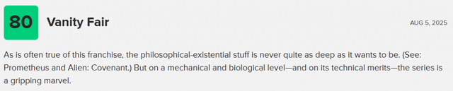 이 프랜차이즈에서 흔히 그렇듯, 철학적이고 실존적인 담론은 늘 의도한 만큼 깊이 있진 않다. (프로메테우스와 에이리언: 커버넌트를 떠올려보라.) 하지만 기계적‧생물학적 차원에서는, 그리고 기술적인 완성도 면에서는 이 시리즈는 손에 땀을 쥐게 하는 경이로움이다.