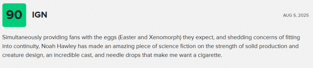 팬들이 기대하는 요소들을 동시에 챙기면서도, 기존 설정에 얽매인다는 우려는 말끔히 벗어던진 노아 홀리는 뛰어난 제작력과 크리처 디자인, 믿기지 않을 만큼 훌륭한 캐스트, 그리고 담배 한 대가 절로 생각나는 선곡을 바탕으로 놀라운 SF 작품을 완성해냈다.