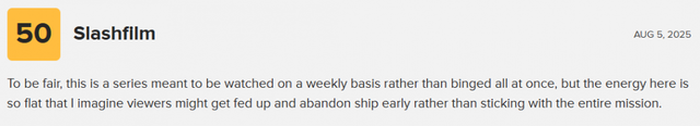 공정하게 말하자면, 이 시리즈는 한 번에 몰아보기보다는 매주 한 편씩 감상하도록 설계된 작품이다. 하지만 초반의 에너지가 너무 밋밋해서, 많은 시청자들이 끝까지 함께 항해하기보다는 중도 하차를 택할지도 모르겠다.