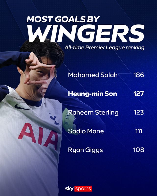 손흥민이 윙어로는 프리미어리그에서 역대 두 번째로 많은 득점 기록을 남긴 채 영국을 떠났다. 프리미어리그 커리어 내내 토트넘 홋스퍼에서만 활약한 손흥민이 지난 10년간 프리미어리그에서 터트린 득점은 무려 127골이다. 프리미어리그 33년 역사에서 손흥민보다 더 많은 골을 넣은 측면 공격수는 리버풀의 '파라오' 모하메드 살라가 유일하다. 살라는 지금까지 186골을 기록했다.