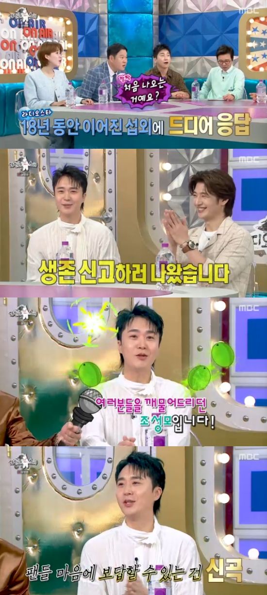 이날 조성모는 18년만에 '라디오스타'에 처음으로 출연한다면서 "'라스' PD님들이 바뀌실 때마다 저한테 출연 요청을 주셨다. 근데 방송이 너무 매운 맛이라 못 나왔는데, 이젠 나이도 먹었고, 생존신고를 하러 나왔다"면서 웃었다.