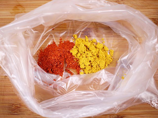 위생봉투에 카레가루 1큰술, 고춧가루1큰술을 넣고 잘 섞어요.