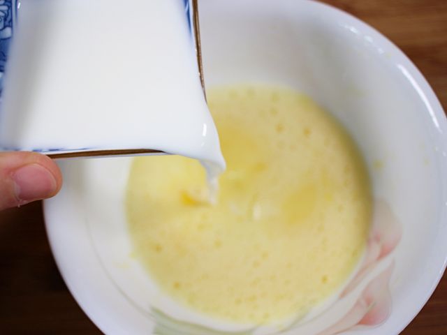 계란 1개를 풀고 우유와 1:1 비율로 섞어요.
