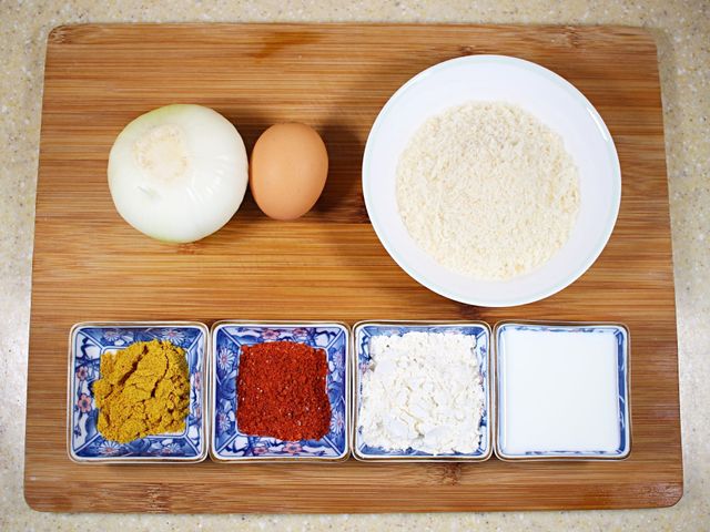 재료는 양파, 카레가루, 달걀, 튀김가루,