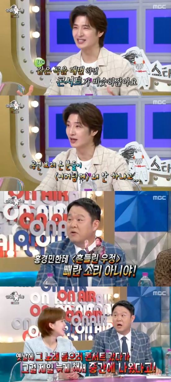 이를 들은 김구라는 "그런 걸 누가 좋아하냐. 그거 보러 가는데 그걸 안하면 어떡하냐. 홍경민이 '흔들린 우정'을 안 부른거랑 같은거다. 내가 예전에 홍경민 공연 보러 갔다가 그 노래를 너무 늦게 불러서 내가 중간에 나왔다고!"라고 말해 웃음을 자아냈다.