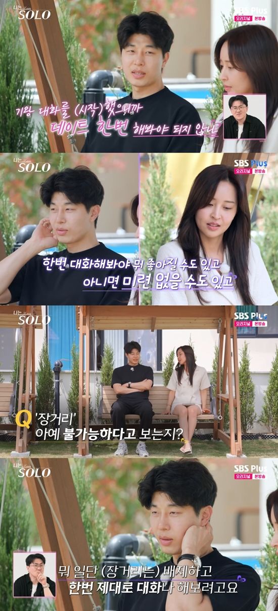 이에 정숙은 "모든 게 빨리 흘러가서 못 따라가겠다. 어제도 말씀드렸듯이 자기소개 할때 딱 '2시간' 하셔서 '안 되겠구나' 마음을 접었다. 그래서 장거리는 아예 불가능하다고 생각하시냐"라고 질문했다. 영수는 "불가능하다고 생각한다. 그런데 일단 배제하고 한번 제대로 얘기해 보려고 한다"라고 말했다.