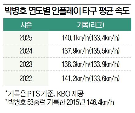 흥미로운 건 박병호의 인플레이 타구 평균 속도이다. 한국야구위원회(KBO)가 제공한 PTS(Pitch Tracking System) 자료에 따르면 박병호의 올 시즌 인플레이 타구 평균 속도는 전년 대비 2.2㎞/h 빨라진 140.1㎞/h이다. 2022시즌 이후 3년 만에 140㎞/h대를 회복했는데 그만큼 타구의 질이 향상했다는 해석이 가능하다. 빠른 타구 속도는 이상적인 타구 지표 중 하나인 '배럴'의 기본 전제 조건 중 하나다. 타구 속도마저 줄었다면 '에이징 커브'의 전조 증상으로 해석할 수 있는데 최악의 상황은 피했다. 그런 면에서 BABIP(Batting Averages on Balls In Play)를 주목할 필요가 있다.