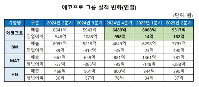 지주사 에코프로는 인니 광물 무역 사업을 통해 2분기 매출 419억 원을 기록했고, 비상장사인 에코프로이노베이션도 리튬 가공 사업 확대로 매출 증가세를 보였다.