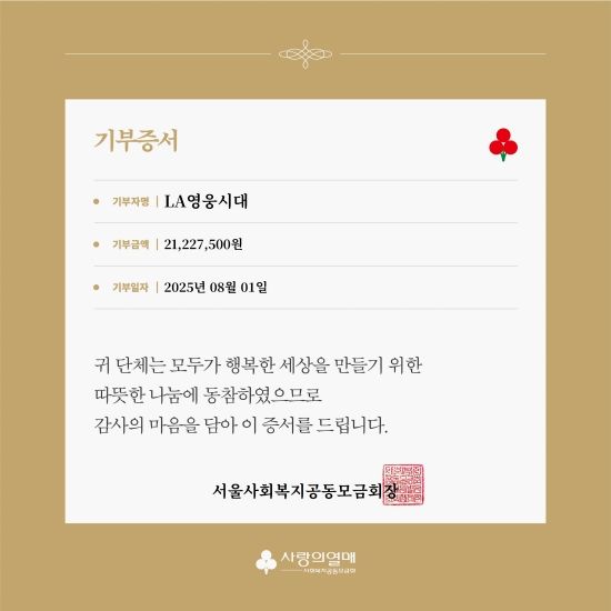 (엑스포츠뉴스 이정범 기자) 'LA 영웅시대'가 2,122만 원을 기부했다.