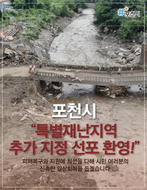 백영현 포천시장은 “이번 특별재난지역 선포는 시민과 함께 이뤄낸 뜻깊은 성과”라며, “포천시는 보다 안정적인 체계를 갖추고 신속한 복구와 피해 주민 지원을 위해 최선을 다하겠다. 무엇보다 근본적인 수해 예방을 위해 항구적인 예방사업도 적극 추진해 나가겠다”고 밝혔다.