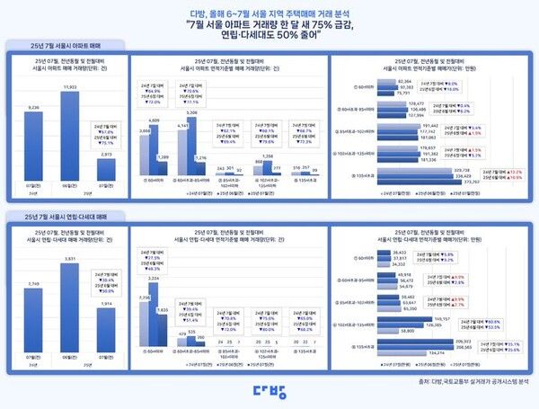 뉴시스 보도에 따르면, 부동산 정보 플랫폼 다방은 국토교통부 실거래가를 바탕으로 6~7월 서울 아파트 매매 거래 1만4906건과 연립·다세대 거래 5745건을 분석한 결과 이같이 확인됐다고 7일 밝혔다.