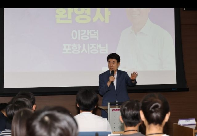 | ▲ 7일부터 8일까지 포스코 국제관에서 동아일보·채널A와 개최한 ‘2025 K-배터리 청소년 아카데미’에서 환영사를 하고 있는 이강덕 포항시장. |